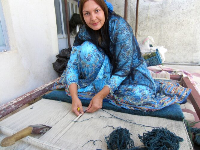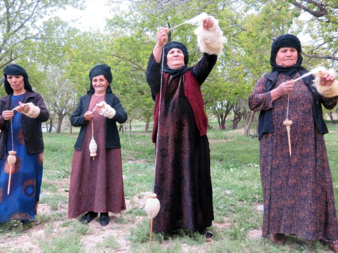 羊の毛を刈り、糸を紡ぎ、大地に自生する草花で染めて、原始的な機械を使って伝統の手織り技術で織り上げます。女性たちが心に感じたままに描く文様には、家族円満や子孫繁栄、健康長寿、水への感謝などの多いが込められています。雄大な自然を映した色彩は、鮮やかで深みのある美しさです。