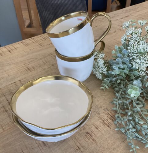 凹凸が見られる真っ白な磁器にゴールドのアクセントが特徴的な「Bell(ベル)」シリーズ。