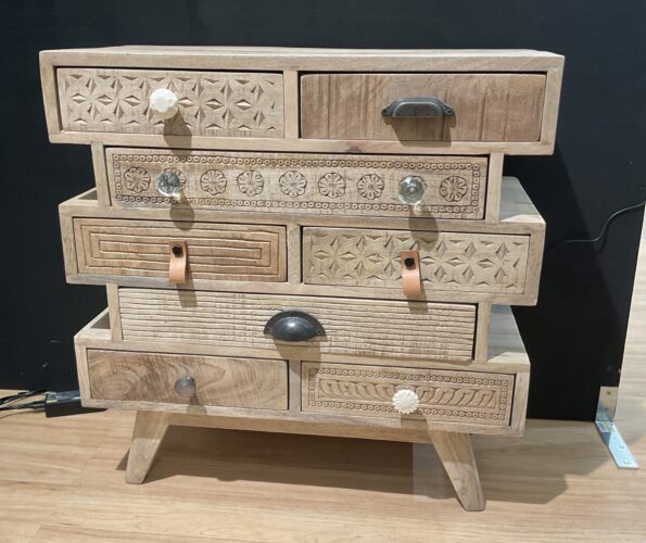 引き出し部分は職人さんが手彫りで模様を描いており、1つ1つデザインの違う取っ手部分からもこだわりを感じます。