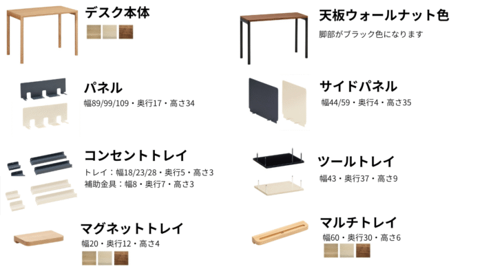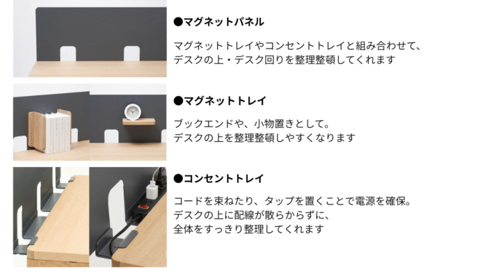 コンセントトレイ(別売り)と組み合わせることで、コード類をまとめやすくしたり、マグネットトレイを組み合わせて机の上を整頓しやすくなります。