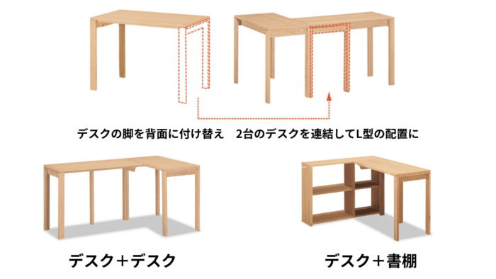 デスクの脚を背面に付け替えることで、デスク同士や書棚と連結してセッティングができます。