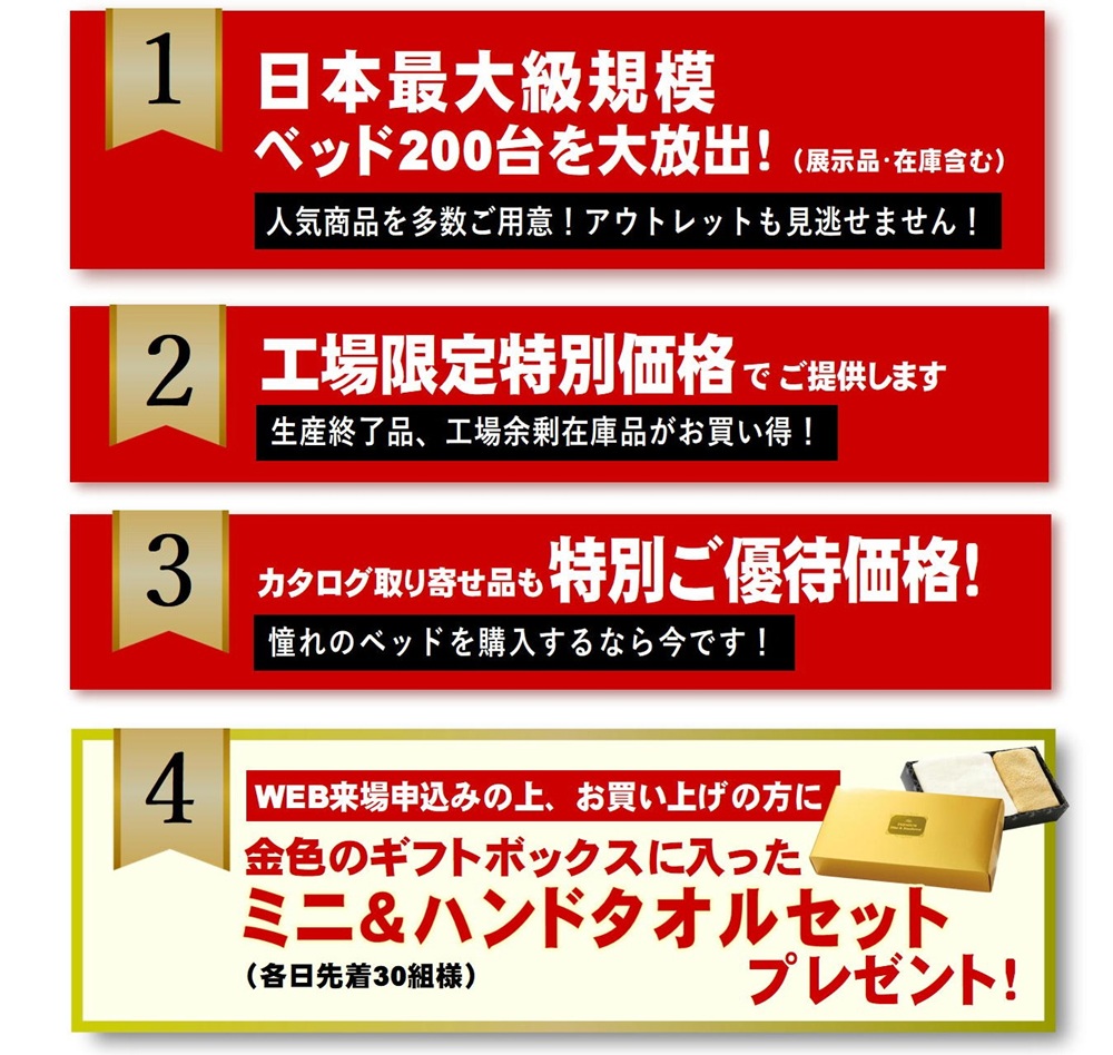 ▶▶工場現地開催だから、高級シモンズベッドがお得に手に入ります!うれしい限定特典もある、毎回好評の工場バーゲンセール!
