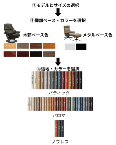 モデルとサイズ、ベースや張地のカラー・ランクを組み合わせることで自分好みのチェアをカスタマイズすることも可能です。